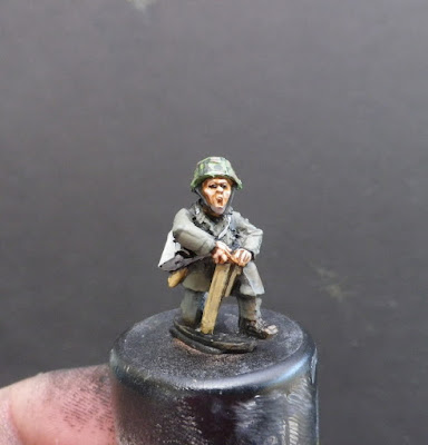 I need 5 NCOs with rifles, but suitable figures are hard to find ( most NCO types have submachine guns) so did some converting so they were pointing or doing hand signals (pics below, the fig on the left is the original pose) I'm going to leave the lieutenant unconverted, he has a pointy hat, but it will give him a bit if character.
